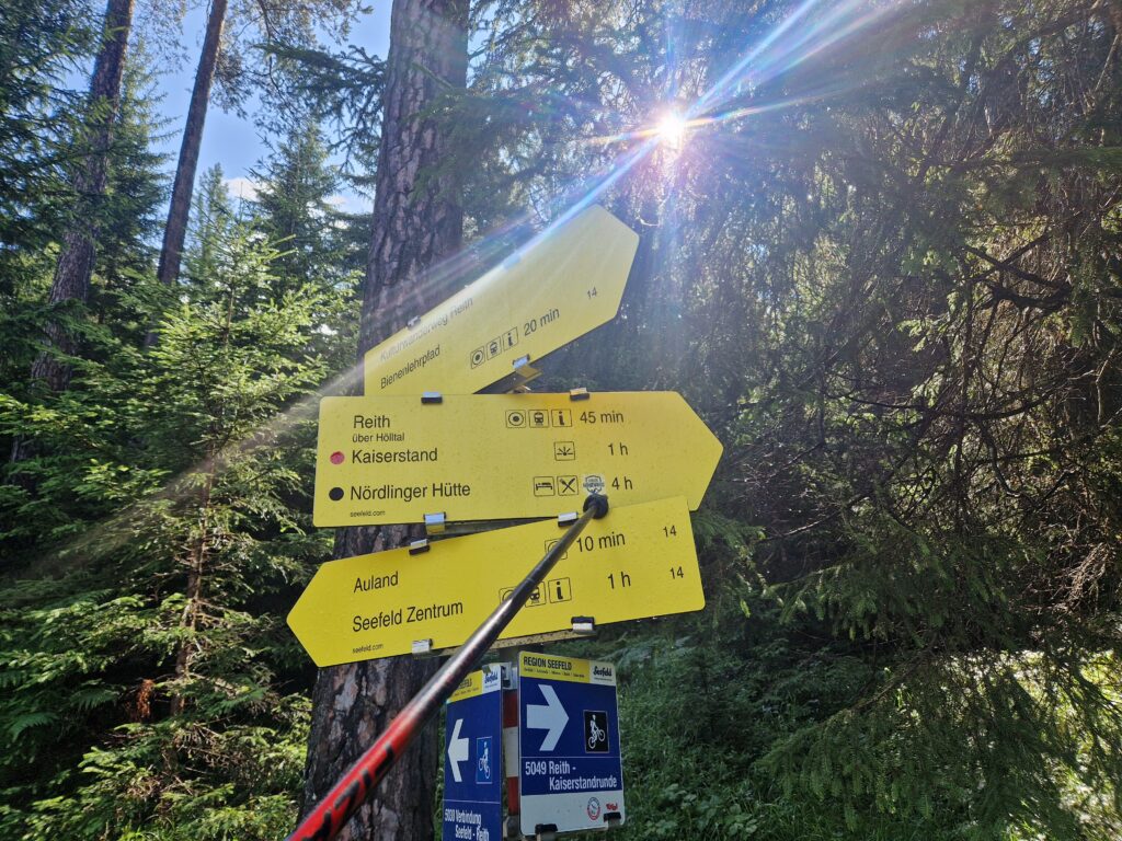 U prvního rozcestníku, kterého dosáhneme po 6 km chůze, se dozvídáme, že na chatu Nördlinger hütte to máme krásné čtyři hodinky🤔😳, tak se jde na to! Nožky vesele zapískají a dávají se do práce😍: