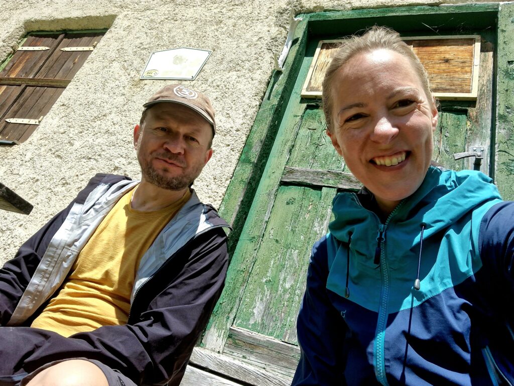 Cesta z té nejvíce nebezpečné části nám trvá asi 45 minut, a pak dalších 45 na chatu Rossehütte, kde si na chvíli sedneme a zchladíme rozehřátá těla😍: