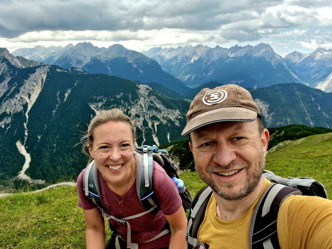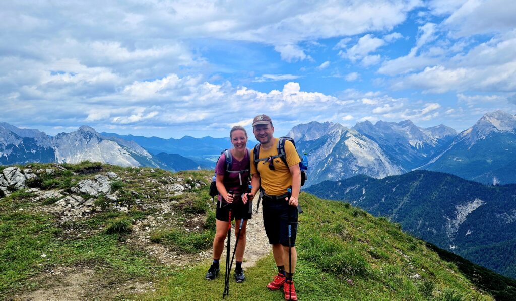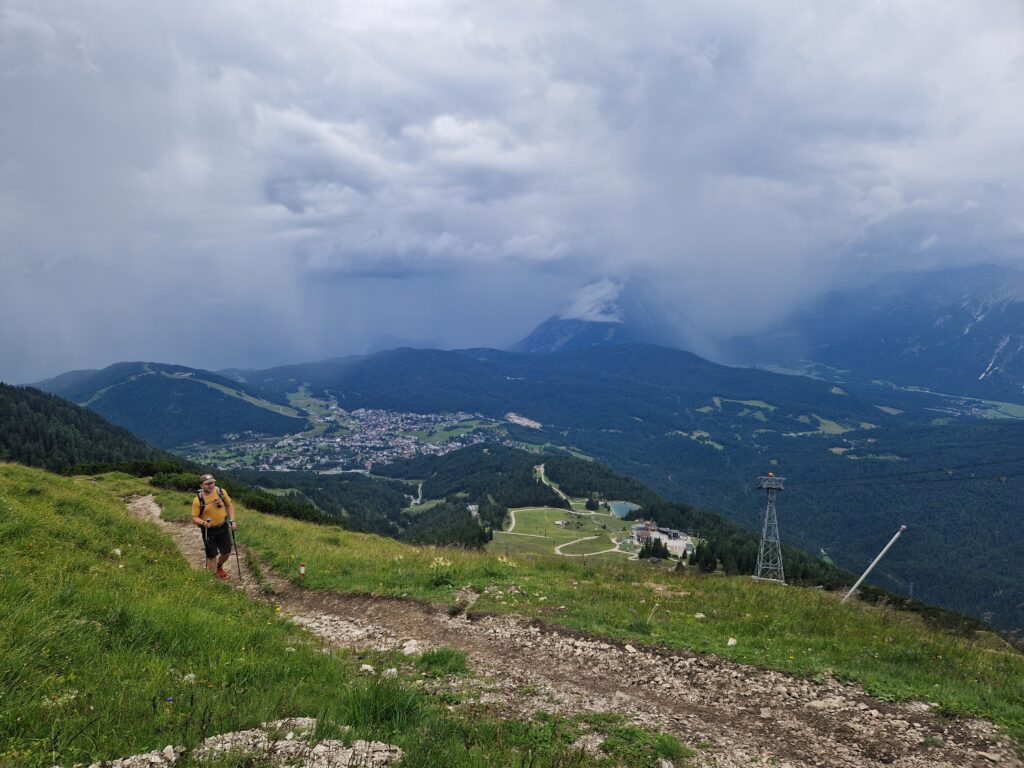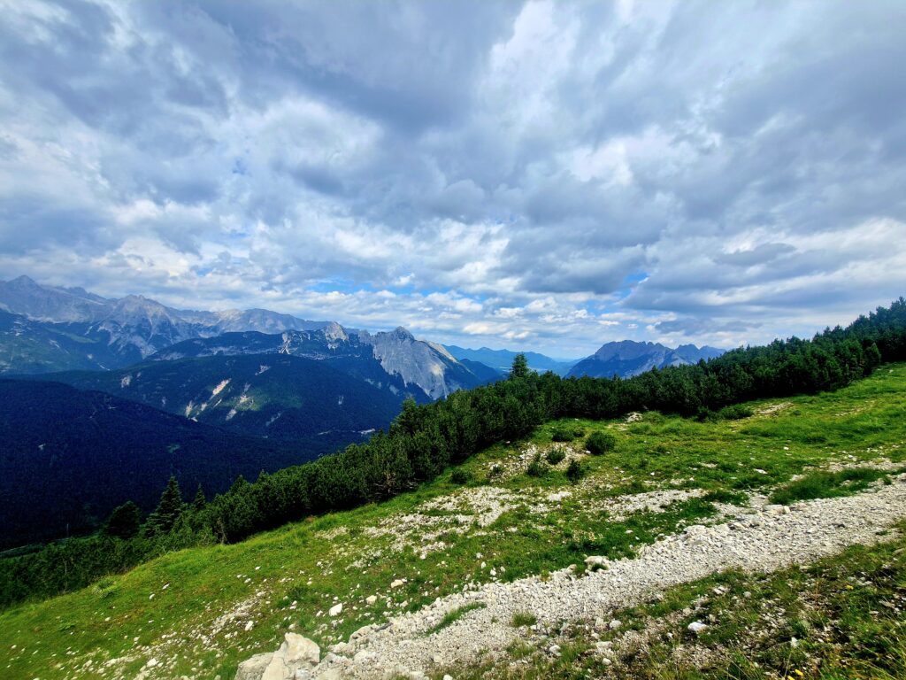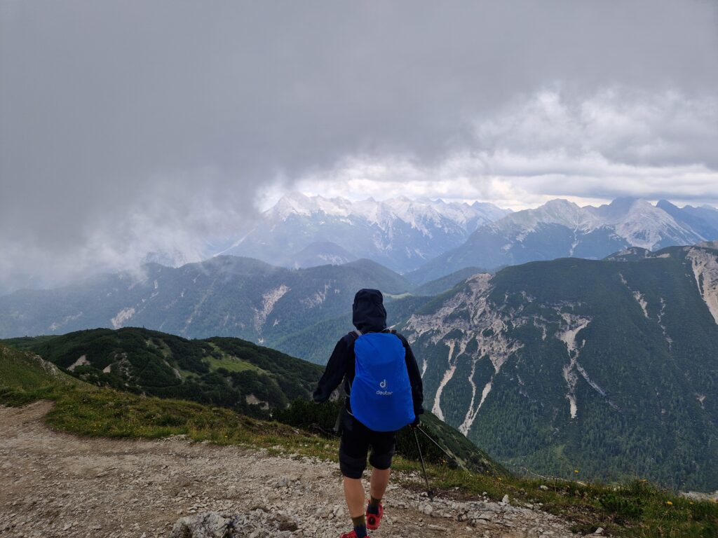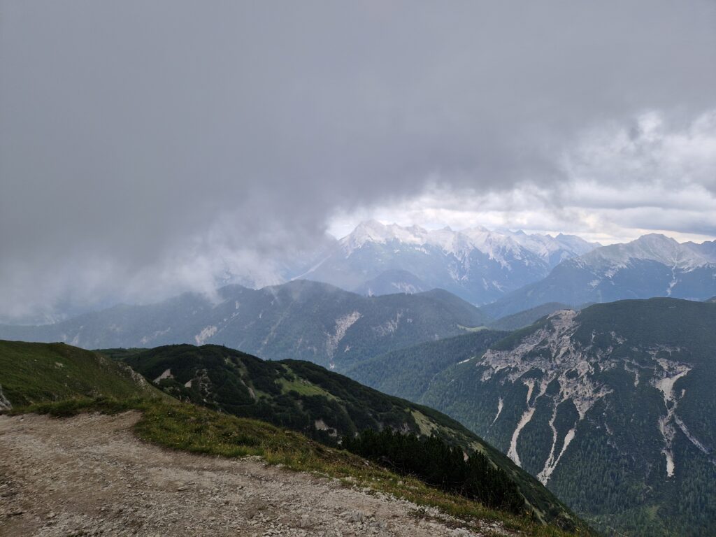 Po asi osmi kilometrech se začínají honit mraky a my zjišťujeme, že ten déšť támhle v dáli jde přímo na nás🙈. Ne, my se nevzdáváme, nejsme z cukru přeci, my to na vrchol zkusíme vyrubat. S námi jde spousta turistů, někteří se zdají být celkem nevybavení, takže jsme ještě v klidu🤣. Na Seefelderjoch jsme ve 13h00 a ty výhledy nás posadí na zadek😍: